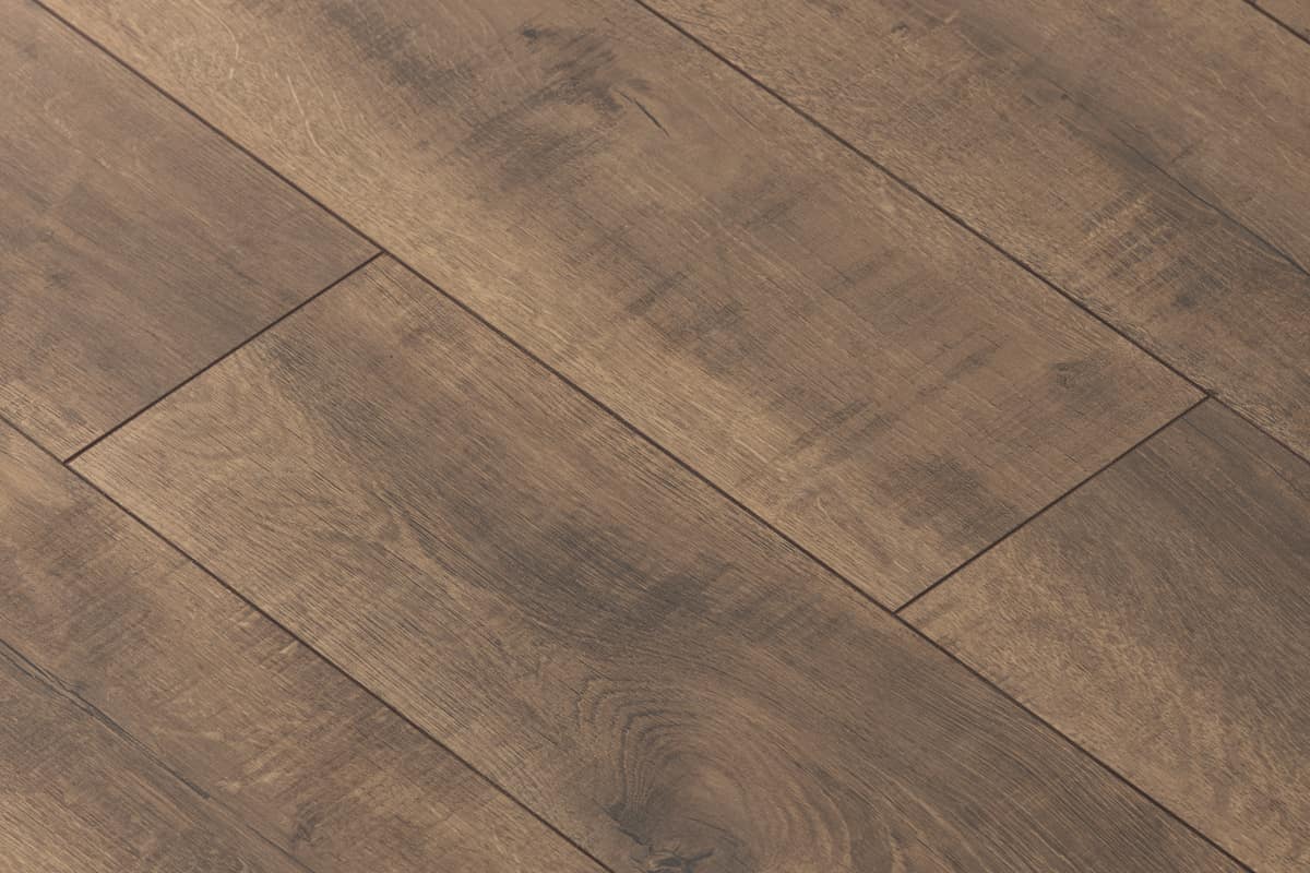 Aqualock 8mm Laminate Flooring in the Toasted Pecan finish features a realistic vintage-oak appearance with defined bevelled edges on each plank.
