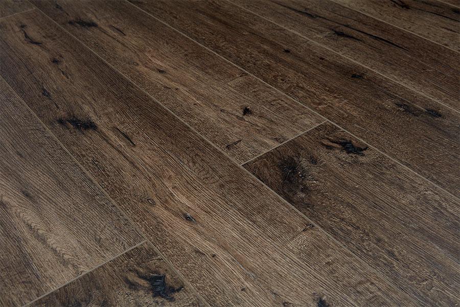 Audacity 12mm Laminate Flooring in the Homestead Oak finish features an aged-oak appearance with a hand-scraped texture and bevelled edges for an authentic wood look.