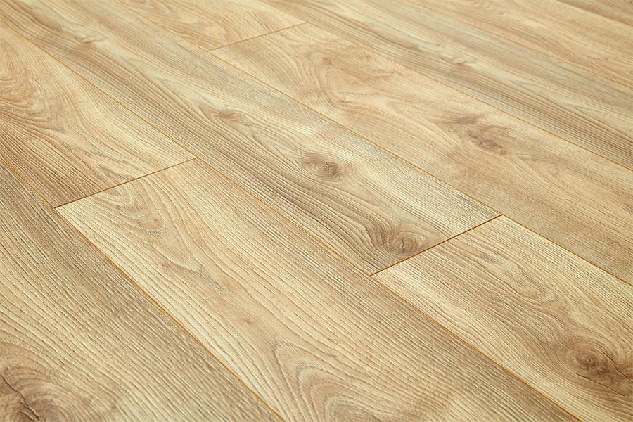 Series Woods 12mm Laminate Flooring in Makro Nature Oak features a classic natural tone and soft grain markings for a realistic wood-effect appearance.